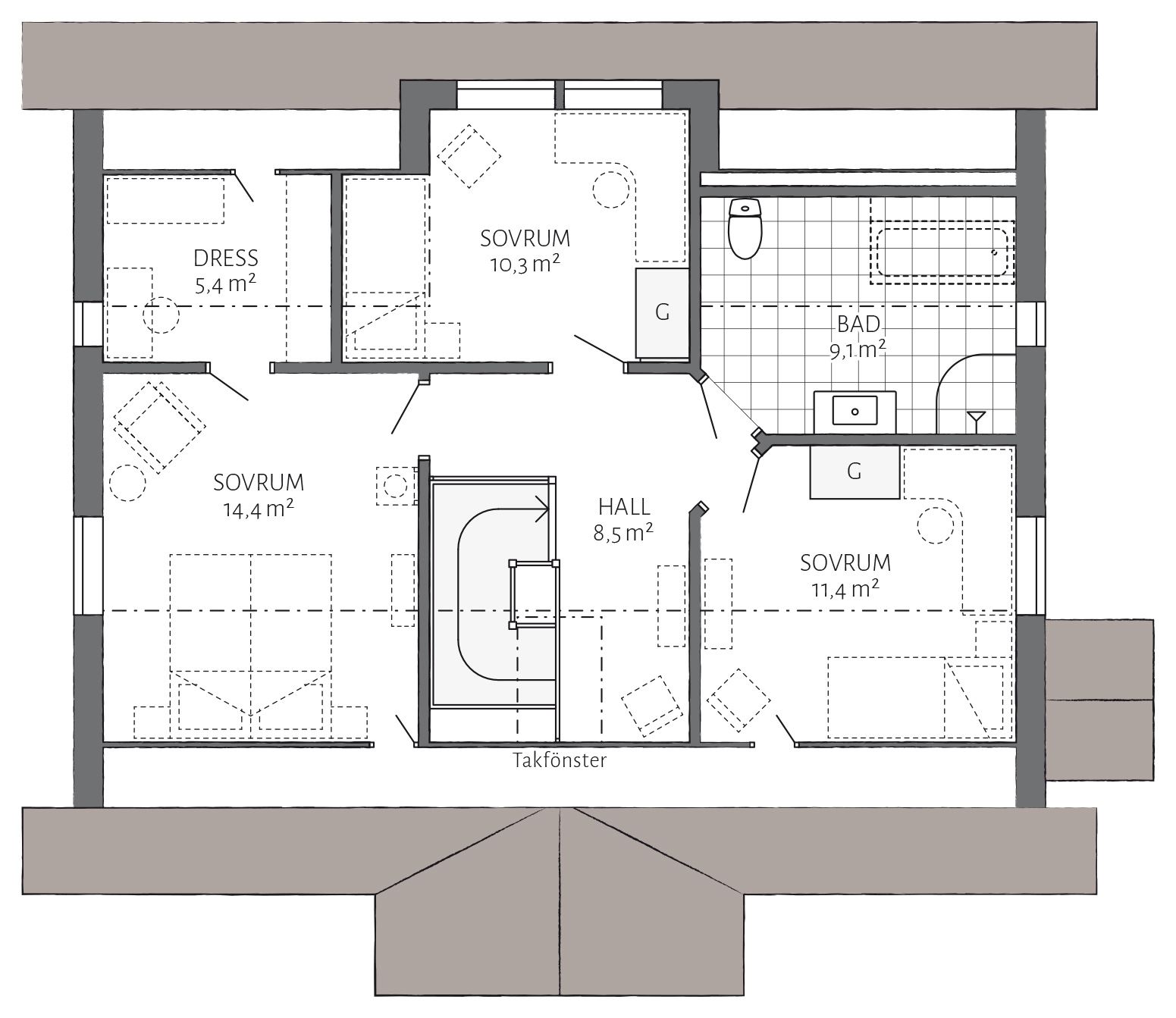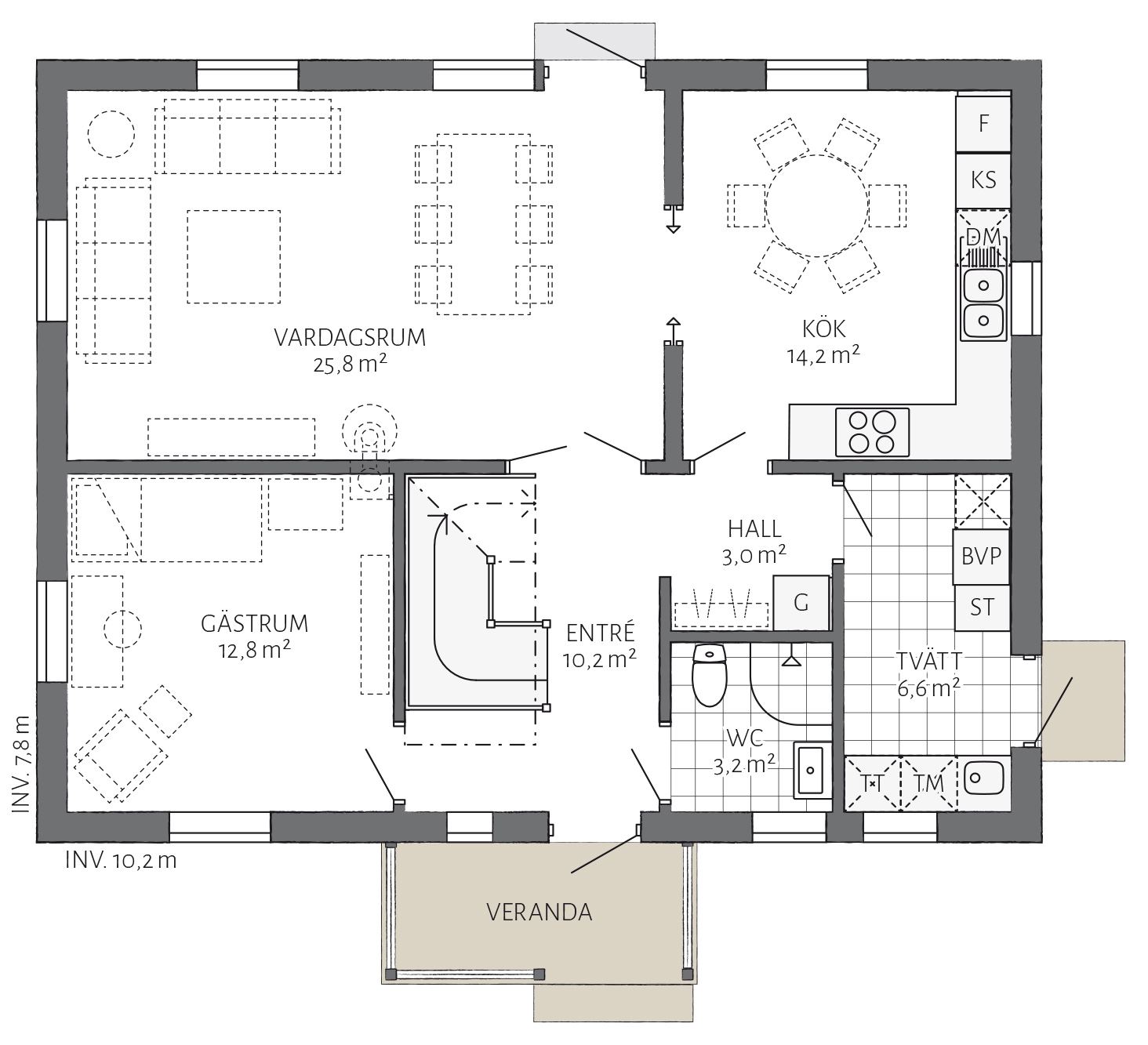 Charakteristisch für dieses große exklusive Haus ist die mittig konstruierte Gaube. Die Frontveranda ist nicht nur ein außerordentlicher Blickfang, sondern auch eine Sitzgelegenheit unter freiem Himmel. Ein originelles Landhaus im typisch schwedischen Stil, das mit seinen kompakten Abmessungen auch für kleinere Grundstücke geeignet ist.