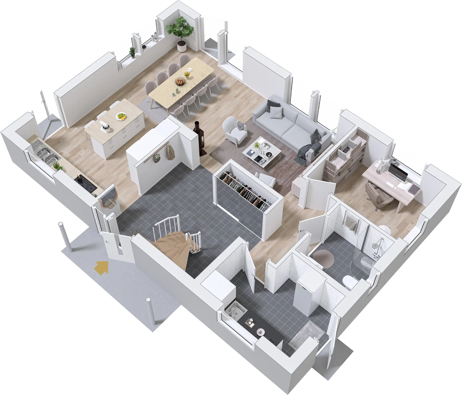 Im Berghem fällt es Groß und Klein leicht sich wohlzufühlen. Der offene Grundriss bietet viel Freiraum für lauffreudige Kinder zum Spielen. Die offen gehaltenen Durchgänge verleihen dem Haus ein offenes Raumgefühl. Die Raumaufteilung glänzt mit viel Stauraum und einem Arbeitszimmer, das leicht zu einem weiteren Schlafzimmer verwandelt werden kann. Das Ergebnis? Ein stilvolles Haus, was mit der Familie wachsen kann und durch seine Größe und Aussehen gut an ein städtisches Grundstück angepasst ist.